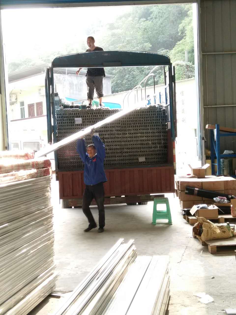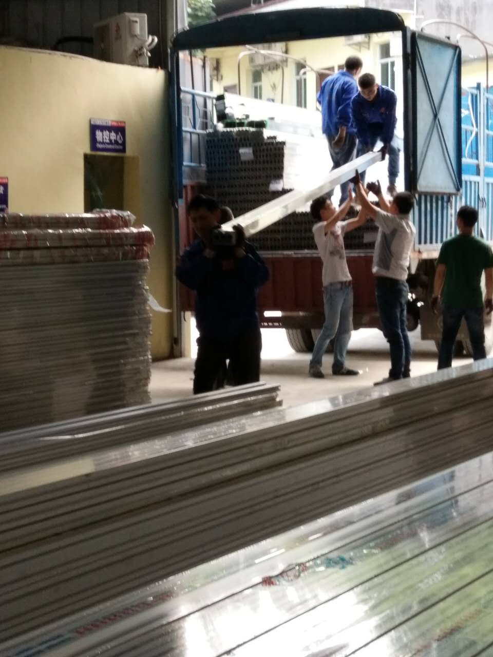 欧亿网页版战士齐心协力一同卸下铝型材,满大车的铝型材转间就转移至仓库。(团结就是力量)