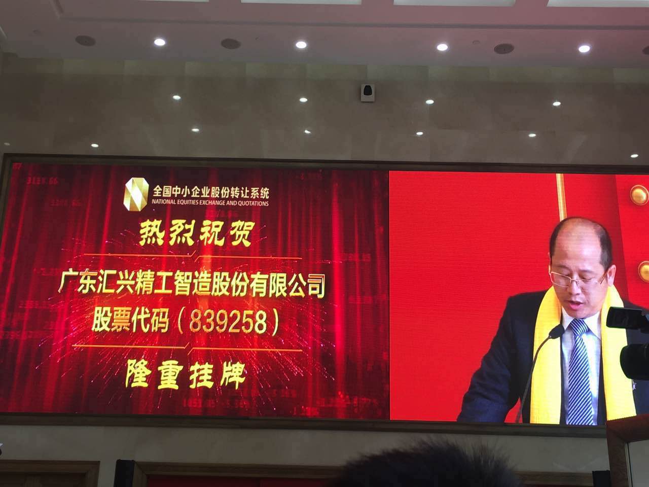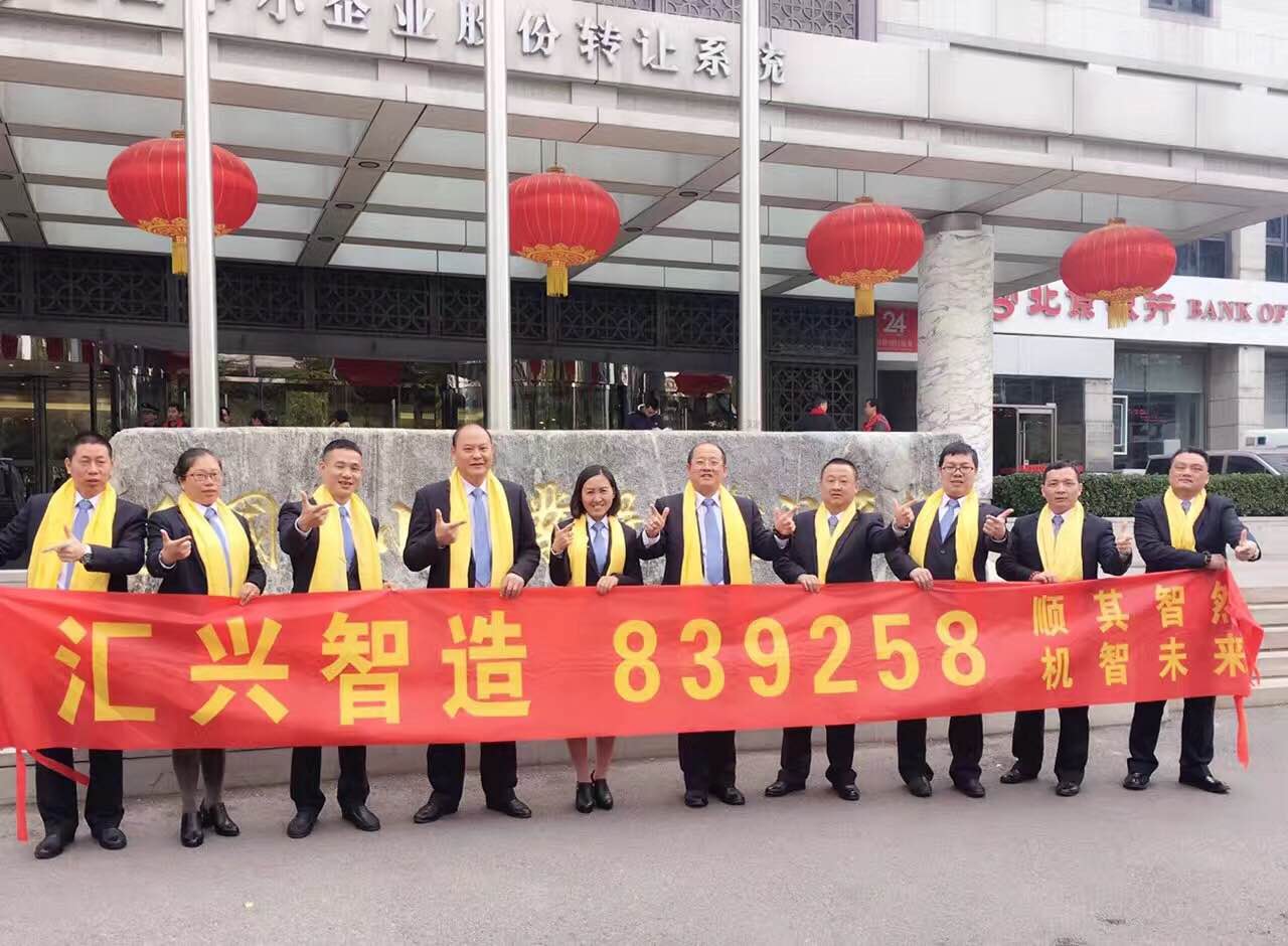 从2015年,汇兴智造启动进军资本市场的战略,在东莞证券股份有限公司、大信会计师事务所(特殊普通合伙)、广东莞泰律师事务所等合作伙伴、各级政府、社会各界的帮助下,开始“新三板”挂牌筹备工作,并于2016年5月完成了股份制改造直至今日(2016年11月1日上午10点)在全国中小企业股份转让系统仪式大厅成功挂牌上市。