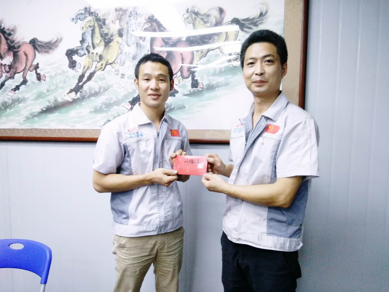 胡总经理(左)为每月度之星代表王文奎(右)颁发奖金