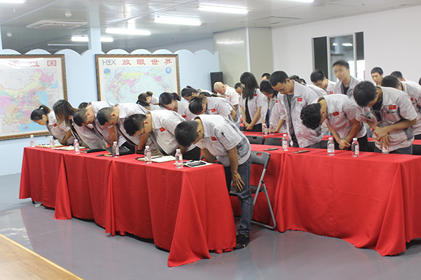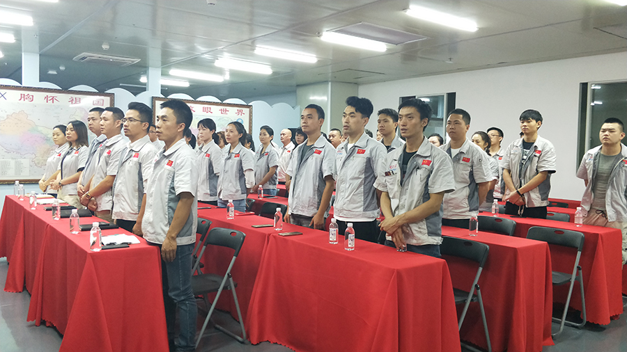 有大家才能有小家,升国旗唱国歌。全体员工精神抖擞,一起唱响国歌-五星红旗迎风飘扬.....从今走向繁荣富强,现场声音嘹亮、士气如虹,着实展现了祖国儿女、新时代接班人的精神面貌。 会议开始,全体员工整肃衣冠,对倍加推崇的孝道、商道、人道郑重鞠躬,庄严宣誓企业愿景:“成为全球领先的智能自动化产业链集成服务商”,企业使命:做受尊敬的好人,造受尊敬的产品,办受尊敬的企业,建受尊敬的平台,企业精神“用情做人、用心做事”,团队精神“忠诚团结、勤奋进取”,工匠精神:创于手、精于工、智于器、匠于心、品于行等。