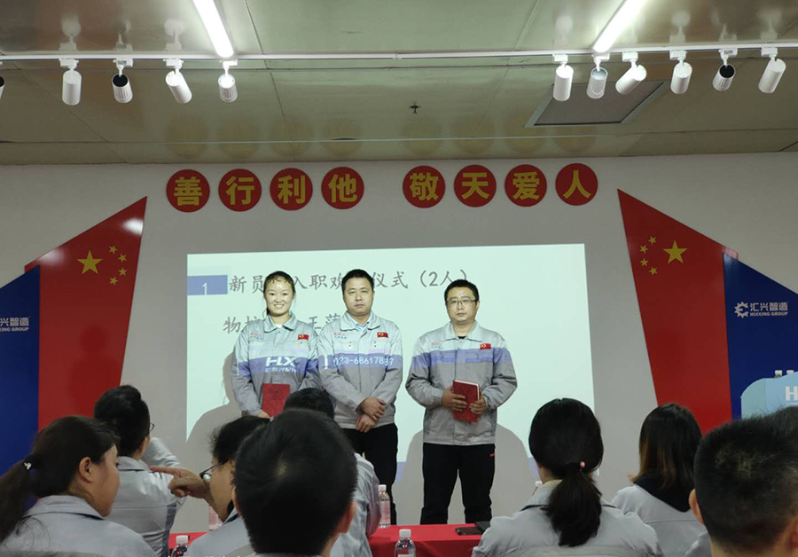会议第二项议程,新员工入职欢迎仪式。企业的发展注定离不开新鲜血液的注入,新的活力的输入,由徐总亲自为新入员工颁发纪念品及新员工代表讲话。