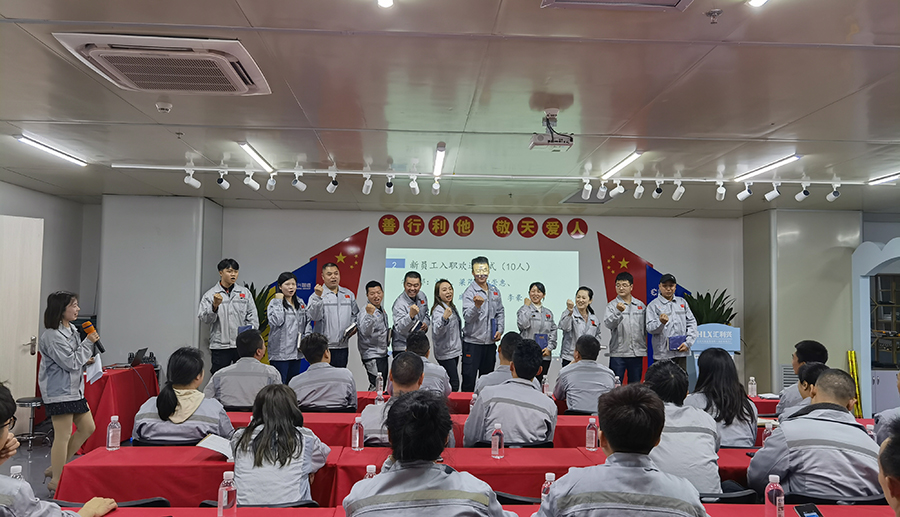 会议开始,三位高管敲响2021年征程的号角,鼓声震天,士气如虹,潜移默化鼓舞着战友们奋勇前进,并以这种以评促进、你追我赶的“激励文化”,鞭策着员工们不断争先创优,推动企业发展内生动力,从而形成“我来干、抢着干、努力干”的工作作风。 会议第一项,企业文化展示。全体员工整肃衣冠,对倍加推崇的孝道、商道、人道郑重鞠躬,庄严宣誓企业愿景:“成为行业优秀的智能自动化产业链集成服务商”,企业使命:做受尊敬的好人,造受尊敬的产品,办受尊敬的企业,建受尊敬的平台,企业精神“用情做人、用心做事”,团队精神“忠诚团结、勤奋进取”,工匠精神:创于手、精于工、智于器、匠于心、品于行等。 会议第二项。新员工入职欢迎仪式,培育新生力量,助力企业发展,增强企业核心竞争力,强化人才建设梯队。由客服部经理石乐欢为新入员工颁发纪念品。
